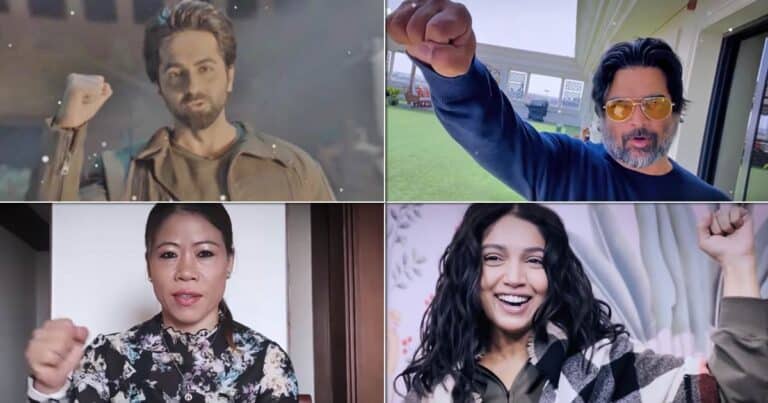 The video starts with Bhumi Pednekar speaking in Konkani, and moves to Andrea who speaks Hindi. Thereafter a host of celebrities – Mary Kom – Manipuri, Huma Qureshi – Urdu, Kunal Khemu – Kashmiri, Vishal Dadlani – Sindhi, Pratik Gandhi – Gujrati, Anurag Saikia – Assamese, Juhi Singh – Dogri, Aamir Ali – Hindi, Anubhav Sinha – Odia, Ammy Virk – Punjabi, Amruta Khanvilkar – Marathi, Ankushita Boro – Bodo, Dhananjay – Kannada, Manoj Bajpai – Maithili, R. Madhavan – Tamil, Rashmika Mandana – Telugu, Remo D’souza – Malayalam, Sumbul Touqueer – Hindi, Anubhav Sinha – Santali, Yash Dasgupta – Bengali, and Ayushmann Khurrana – Sanskrit.