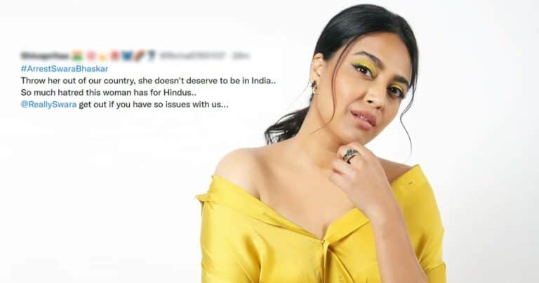 Another wrote, “@ReallySwara you are openly tweeting against my religion without any consequences,it means that Hindutva isn’t terror. Had it been a terror,then next moment you would’ve seen “sar tan se juda” posters against you. Have some shame.”