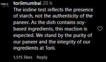 Torii explained, “As the dish contains soy-based ingredients, this reaction was expected. We stand by the purity of our paneer and the integrity of Torii.”