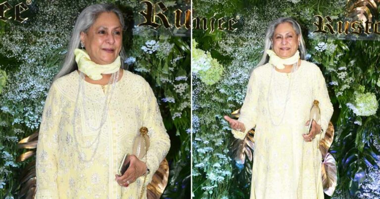 Speaking of last night’s Abu Jani and Sandeep Khosla’s event, Jaya Bachchan was seen wearing a yellow coloured kurti with white pants and had her hair open. She paired it with golden sandals and finally held a clutch in her hand. The yesteryear actress smiled at the paparazzi as she posed for pictures. She even jokingly said, “Dekha kitna smile kar rahi hoon.” She also said that it’s because of Abu-Sandeep and also because the paps are behaving so well.