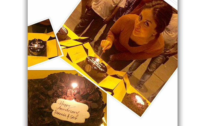 Kareena Kapoor Khan who is shooting for ‘Ki And Ka‘ celebrated her anniversay with three chocolate cakes which were brought by film’s team with ‘Happy Anniversay Kareena and Saif’ written on it.