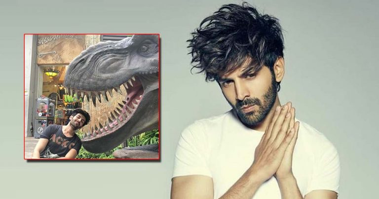 In an Instagram picture Kartik posted, he is at an amusement park next to a dinosaur figure, pretending to slide his head into the animal’s wide-open jaws.