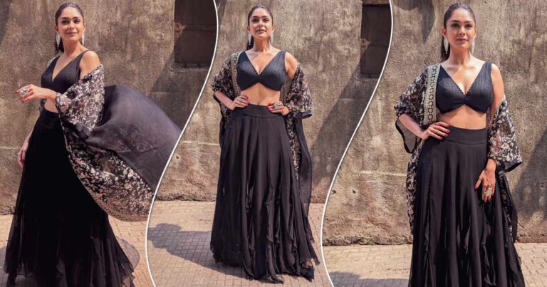 Taking to her recent Instagram post, Mrunal recently shared some radiant pictures looking like a ray of sunshine as she basks in the sunlight in a black ethnic ensemble. Making a sophisticated yet bold appearance, Mrunal is seen being her chirpy self in a ribbed black lehenga-choli. The strapless revealing blouse featuring a plunging V-neckline has been paired with a loose and translucent gold-embroidered jacket, creating a stunning contrast.
