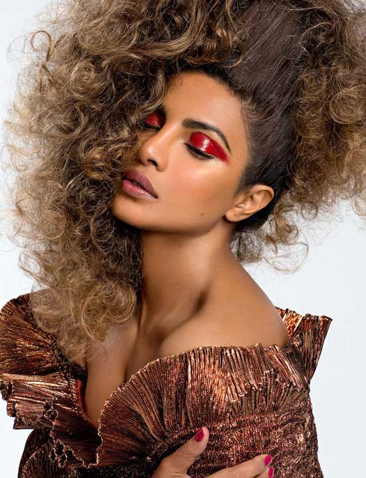 She has managed to epitomise feisty and fierceness in this shoot, going for bold and bright makeup and wild child-like hair. Inclining towards bohemian fashion, she wore a Vivienne Westwood golden outfit styled by Jimi Urquiaga, with a netted-veil over her face from her head. Her otherwise wavy hair was styled into mangy, wild brown curls by Danilo. Take a look at the pictures here: