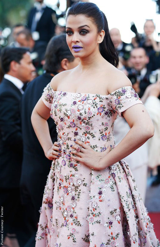 Actress Aishwarya Rai Bachchan, who has marked her 15th year at the Cannes Film Festival, stood out with a purple pout when she stepped out on the red carpet of the gala for the screening for her forthcoming film Sarbjit.