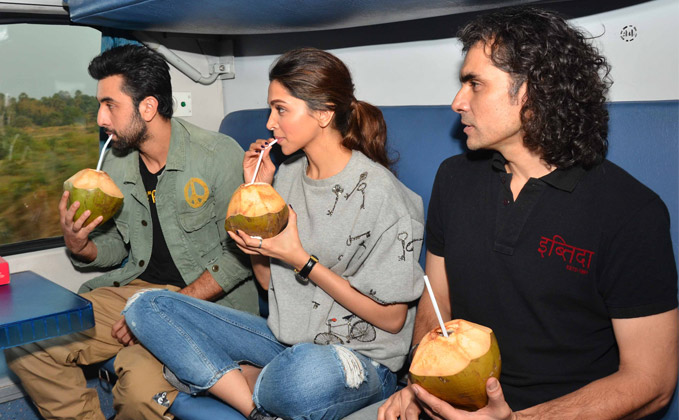 Actors Deepika Padukone and Ranbir Kapoor along with director Imtiaz Ali ditched the convenient flight service and boarded a train from here to the capital to promote their forthcoming film “Tamasha“.