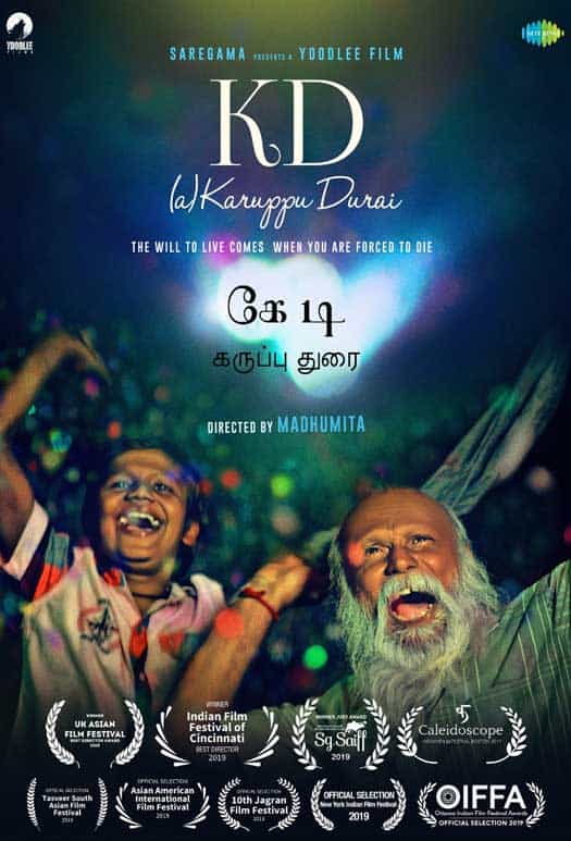 K.D. : This Yoodlee production tackles the theme of innocence, ageism, human connection and loneliness. Written and directed by Madhumita, the film tells the story of Karuppu Durai (Mu. Ramasamy), an ailing patriarch who wakes up from a coma, and realises that his children (except his youngest) want to euthanize him. He escapes in an attempt to save his life and ends up befriending an orphan named Kutti (Naga Vishal) who names him K.D. Together, they begin the quest of a lifetime to fulfil wishes, live dreams, bond with each other and forge a connection that they have missed all their life with one another. Naga Vishal went on to win the National Award for Best Child Artist.