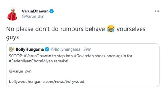 According to earlier reports in Bollywood Hungama, Varun Dhawan had been roped in to play one of the leads in Bade Miyan Chote Miyan 2.0. While the original film had Amitabh Bachchan and Govinda playing the main leads, producer Jackky Bhagnani wanted to remake it for the longest time. But the actor himself has refused this news and called it a rumour. In fact, he also tweeted and asked the portal to behave themselves. Check out his tweet below: