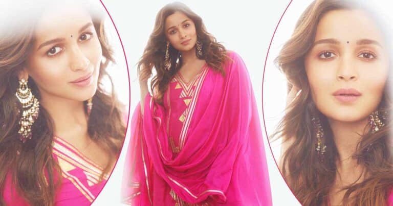 Alia Bhatt’s dark pink coloured sharara set came with golden and silver gota-patti work over it and a matching dupatta to finish off the look. For makeup, the Brahmastra actress went with soft glam with pink smokey hues on the eyes, flushed cheeks and nude lips.