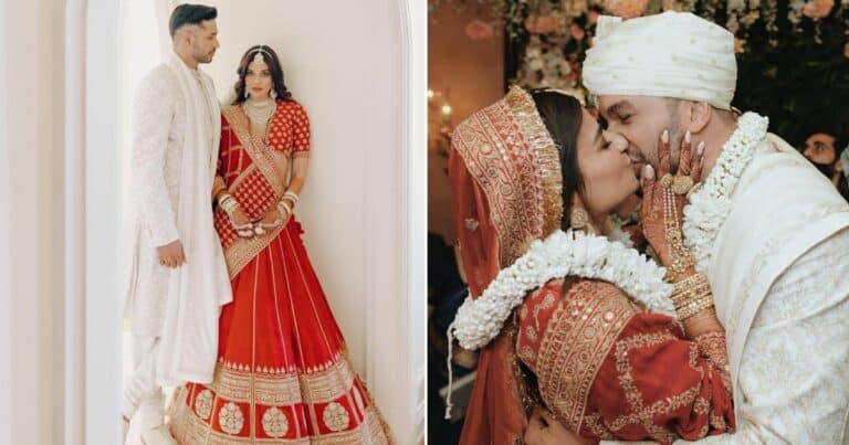 Arjun Kanungo and Carla Dennis looked mesmerizing in an Anita Dongre sherwani and Sabyasachi lehenga. Arjun looked Prince Charming in the simple all-white, yet detailed Sherwani by Anita complete with a white shawl and matching shoes. While her hubby stuck to white, the new bride looked breathtaking in red.