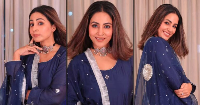 Recently, Hina Khan shared a video on Instagram that sees her nailing the desi look. In the clip, the actress is seen wearing navy blue ethnic attire. Hina opted for a plain blue kurta with small flowers and paired it with the matching palazzo with heavy borders. She completed her salwar suit with a sheer starry dupatta with Kiran detailing at the hemline of the dupatta.