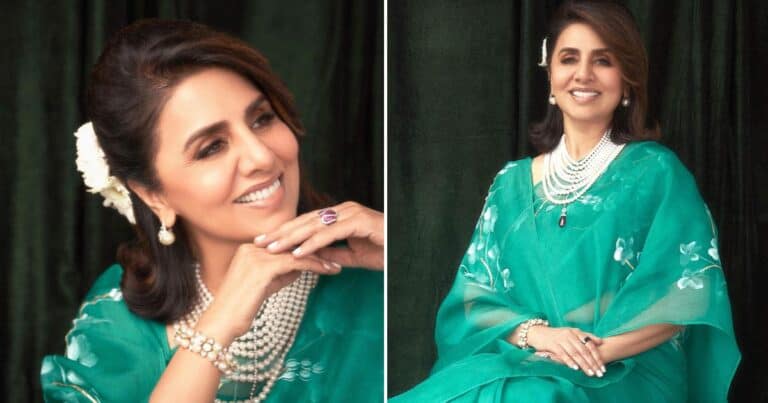 We recently got our hands on a few photos of Neetu Kapoor that saw her exuding royalty in an altogether different manner. For one of her appearances on Dance Deewane Juniors, in June, the actress looked like a queen in a green saree. The actress opted for a floral green organza saree which has hand-painted Pista Phool flowers on an emerald green pure silk organza saree enhanced with hand embroidered gota. Neetu Kapoor paired her look with a white pearl rani haar, which has a Kundan drop at the bottom.
