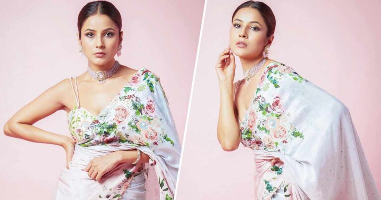 Shehnaaz Gill Is A Floral Beauty As She Drapes A Pastel Saree With A Plunging Neckline Blouse ( Photo Credit – Instagram )