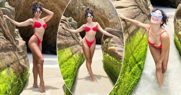 Now, the Tick, Tick…Boom! actress has posted pics from her fun beach day where she rocked a gorgeous bright red bikini and stood out from the serene background. Vanessa Hudgens shouted summer while showing off her curves and toned midriff. The actress’ swimwear consisted of a pair of high-legged bottoms and an underwire bikini top.