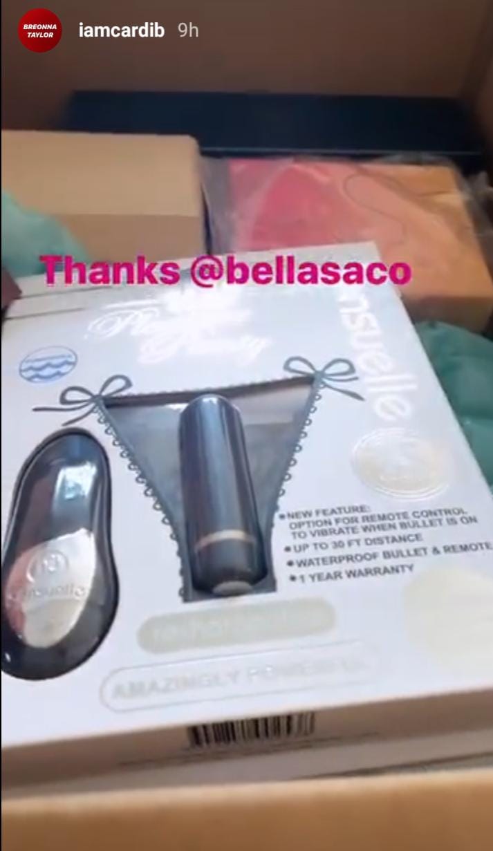 In the next story, she shared the gifts the racy boutique sent her. The gift came wrapped in a big pink box with a golden ribbon and big bow. And was inside is something that we bet Cardi B didn’t expect. The rapper and family were all giggles when they found the box full of v*brators.