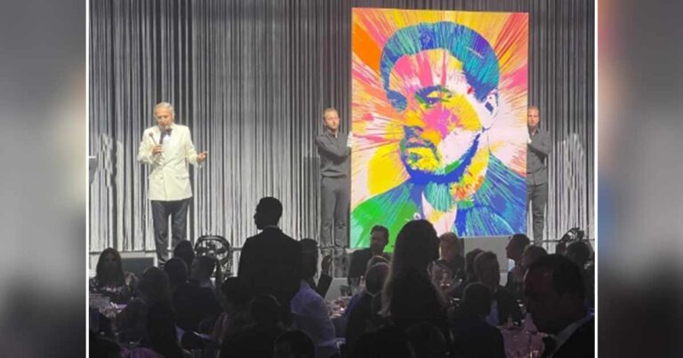 At around midnight, the charity devoted to raising money for AIDS research unveiled a one-of-a-kind portrait of Leonardo DiCaprio. Two men rolled the large canvas of art onstage, as if they were handling the Mona Lisa. This was not a gag — it was, in fact, actually valuable, notes ‘Variety’.