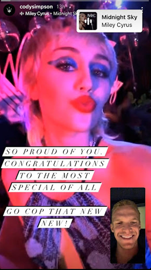 Yesterday, Cody Simpson took to his Instagram after Midnight Sky premiered and with a picture of Miley Cyrus on his Instagram story he wrote “So proud of you”.