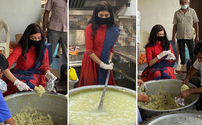 In the pictures the actress can be seen with face mask and gloves, lending a helping hand to the volunteers in cooking and packing of food for those in need.