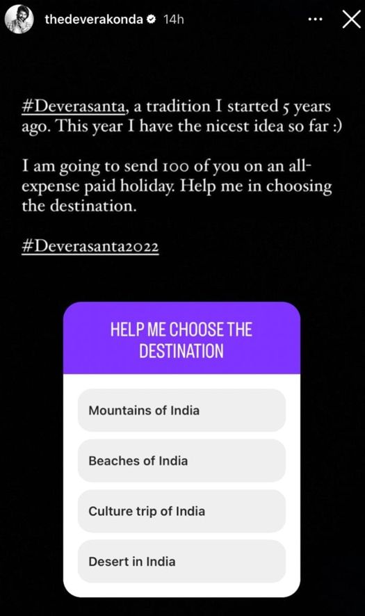 As every year Vijay comes up with new and exciting gifts to make Christmas more special for his fans with #Deverasanta, this year’s #Deverasanta2022 plan is quite bigger and special as he has planned to arrange a trip for 100 fans which will be fully free. While this has left his fans in sheer surprise, the star further raised the excitement with a poll on his social media for his fans to help him choose the destination for travel to offer to his fans. He wrote the caption –