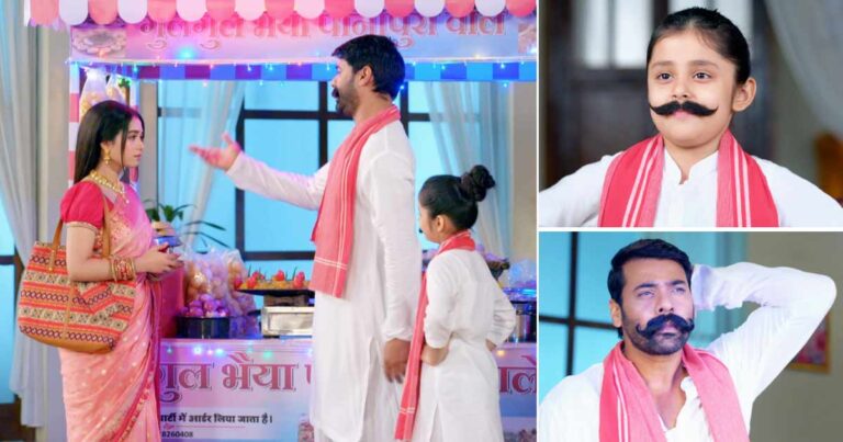 The family members laugh seeing Gungun dressed up as chotu. She tells Radha that they know that she was missing the pani puris of Barsana and that’s why they brought the stall to her. Mohan asks Radha if she will have spicy or sweet while Gungun makes Radha sit on the chair.