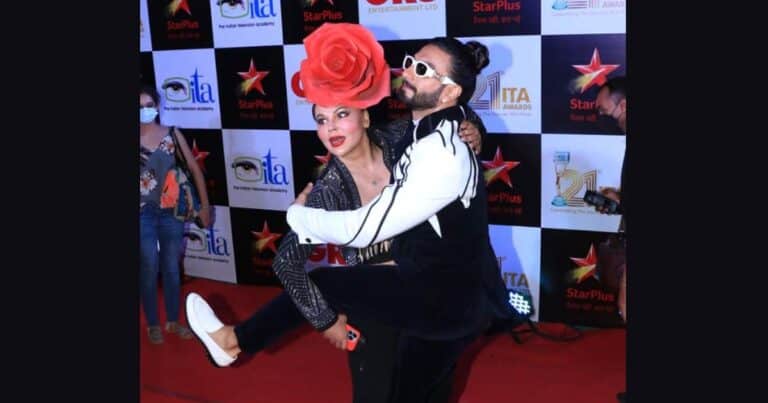 In the most recent development, actor Rakhi Sawant was seen interacting with paps at ITA Awards red carpet and videos from the event are now going viral on social media. In one of the clips, Rakhi can be seen having a hilarious moment with actor Ranveer Singh while posing for the cameras. They were seen discussing Rakhi’s outfit in a part of the video as she had a huge fake red rose fixed on her neatly tied hair. She called the hair accessory ‘Pushpa inspired’ and Ranveer Singh looked quite impressed with the look. The duo seemed to have a gala time hugging each other tightly while joking and laughing around.