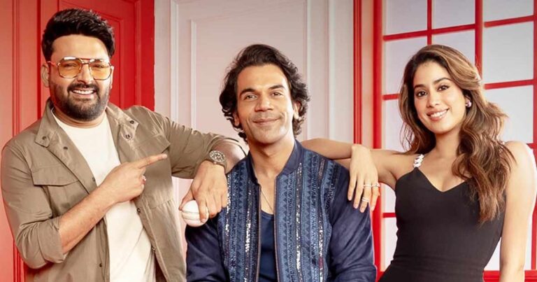 Kapil Sharma asks Rajkummar Rao that he has worked with Janhvi in Roohi earlier, where she played a ghost. Did she scare him more as a wife in Mr & Mrs Mahi or as a ghost? Rajkummar replies, “In love, be it a ghost or wife, it’s the same.”