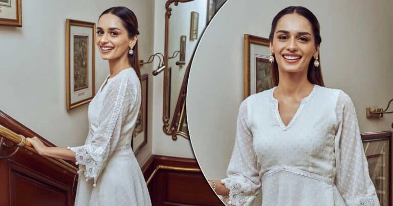 A couple of hours ago, Manushi Chhillar took to social media and shared a series of images where she looks simply beautiful. Captioning them “Mirror mirror 🪞🪞” the Samrat Prithviraj actress slayed the white lacework gharara set like a pro. While the top of the desi look consisted of a white georgette top, cinched at the waist with lace detailing and beautiful, intricate pearl drop work on the hem & sleeves, the gharara featured lacework at the hem.